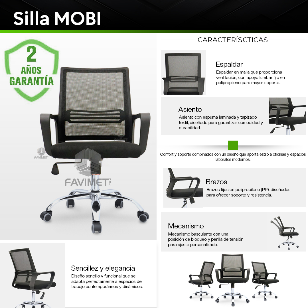 La silla Mobi destaca por su diseño y funcionalidad. Incluye un espaldar en malla con apoyo lumbar fijo en polipropileno (PP), brazos fijos también en polipropileno, asiento tapizado en textil con espuma laminada, y mecanismo basculante con bloqueo y perilla de tensión. Disponible con base cromada estándar o ECO B.