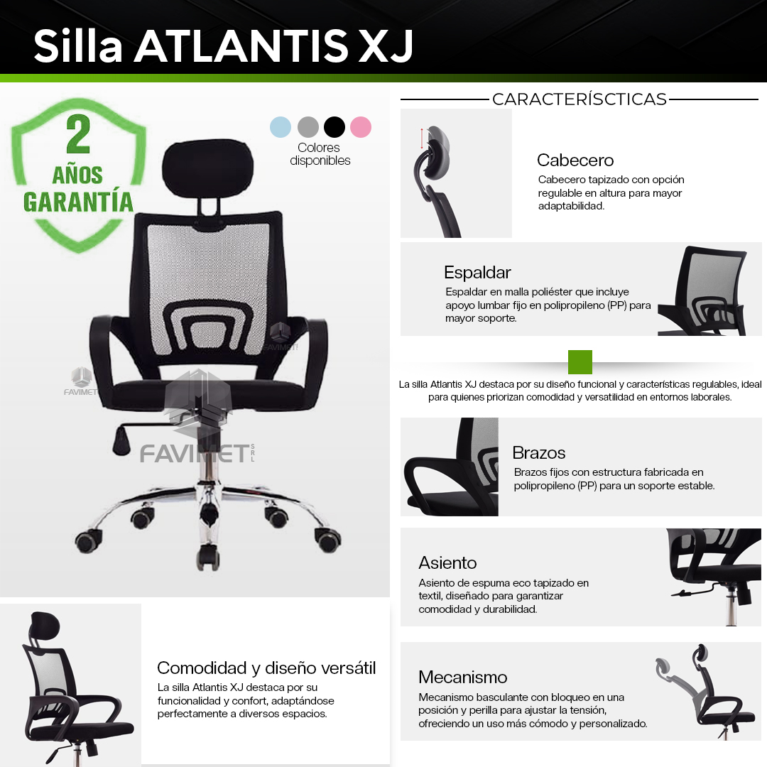 La silla Atlantis XJ es ideal para quienes buscan comodidad y versatilidad. Cuenta con opción de cabecero tapizado regulable en altura, espaldar en malla poliéster con apoyo lumbar en polipropileno (PP), y asiento de espuma eco con tapizado textil para un soporte duradero. Los brazos fijos en polipropileno (PP) y el mecanismo basculante con bloqueo y perilla de tensión ofrecen un ajuste personalizado. Su base cromada de 300 mm y ruedas de nylon garantizan estabilidad y movilidad. Disponible en diversos colores para adaptarse a diferentes ambientes.